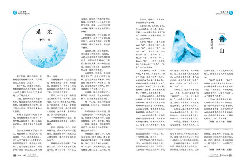 《思维与智慧》杂志是一本益智励志类大众文化期刊,面向国内外公开发行,受到广大读者的喜爱和关注。致力于分享有关思维和智慧方面的知识和经验,内容广泛涵盖了知识、教育、职场等多个领域,旨在为读者提供启发和指导。无论是学生、教育工作者、职场人士还是对知识和思维有兴趣的人群,都能在杂志中找到有价值的信息和启发。